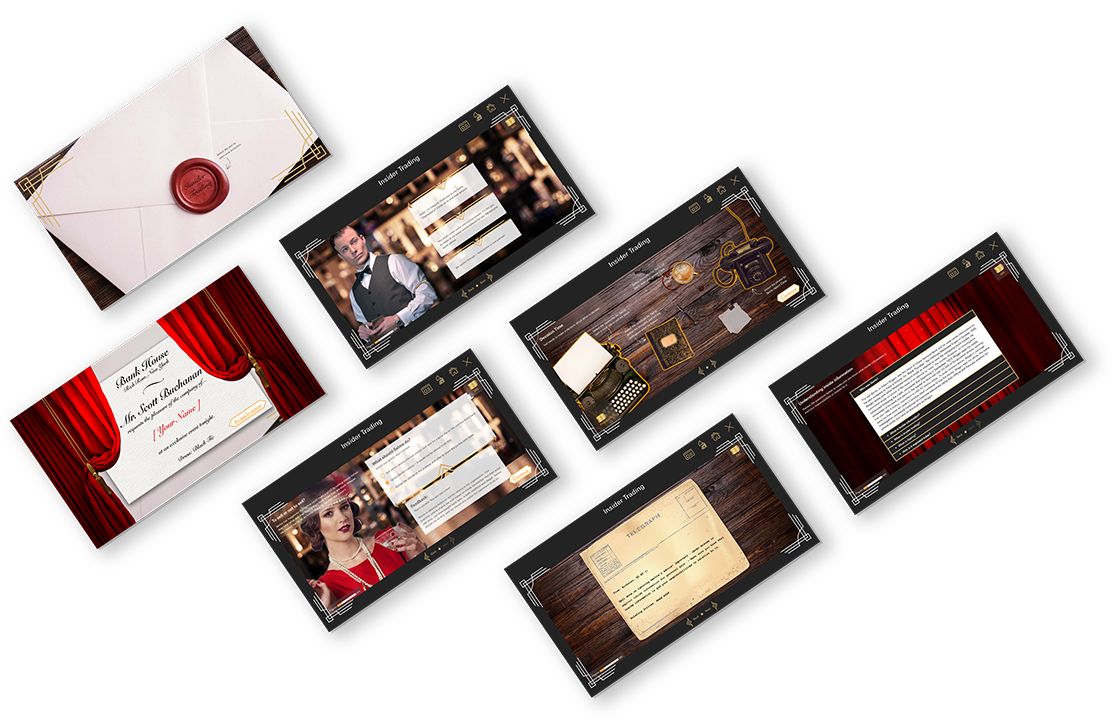 The insider trading module took a more playful, themed approach, drawing inspiration from 1920s visual language and The GreatGatsby. Art-deco styling, period-inspired assets, and narrative-driveninteractions helped transform a complex compliance topic into animmersive and memorable experience.
