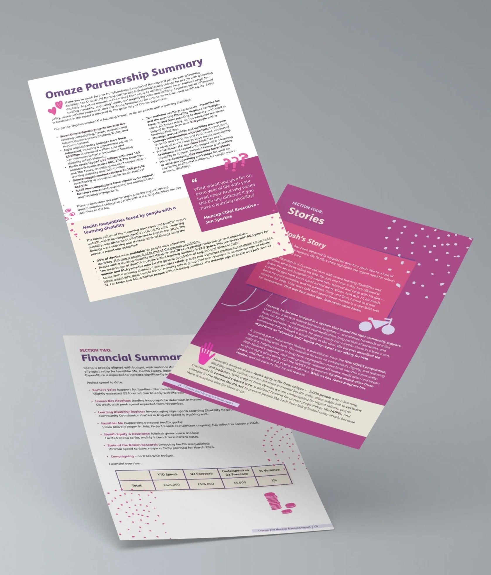 This project involved designing a six-month impact report documenting the outcomes of Mencap’s collaboration with Omaze. The report was created for both digital and print use, and shared internally and externally across stakeholder networks.